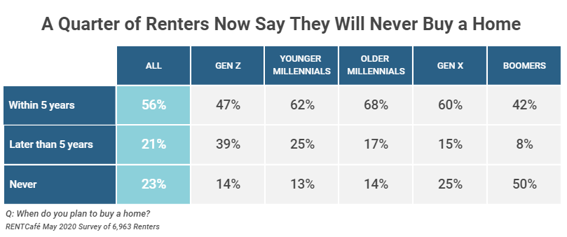 - On the other side, half of baby-boomer renters expressed no intention of ever buying again, as they seem to be getting more and more comfortable with renting.