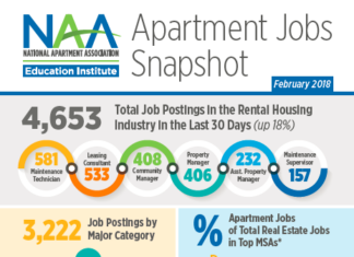Apartment jobs listings jumped up 18 percent in February over January, according to the apartment jobs report from the National Apartment Association Education Institute.