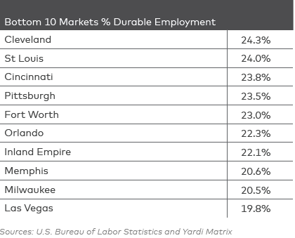 Keeping jobs during downturns, often called “durable employment,” shows up much more in some cities than in others, according to new research from Yardi Matrix.