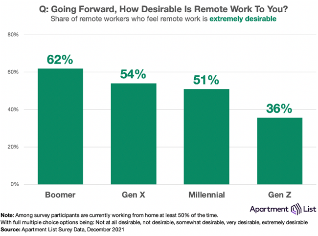 “While older workers appreciate the flexibility afforded by working at home, younger workers miss the in-person connections afforded by working on-site,” write Rob Warnock and Lilla Szini, research associates at Apartment List.
