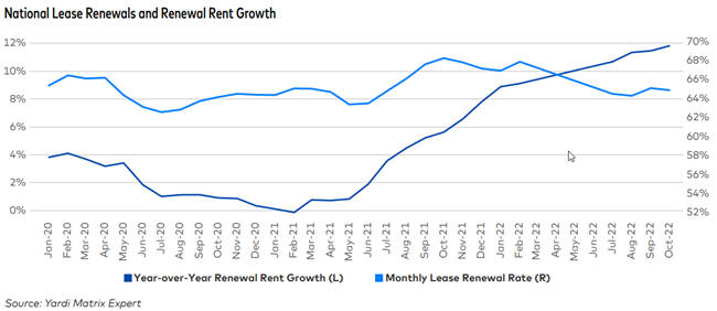Nationally, renewal rents were still surging in the fall, rising 11.8 percent year-over-year through October, up 30 basis points from September. The growth reflects property owners continuing the process of bringing rents of existing tenants closer to asking rates.