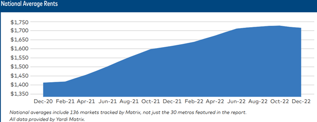 - Multifamily rents fell again in December under the strain of weakening demand. U.S. asking rents dropped $4 during the month to $1,715, while year-over-year growth declined by 80 basis points to 6.2 percent, the lowest level since May 2021